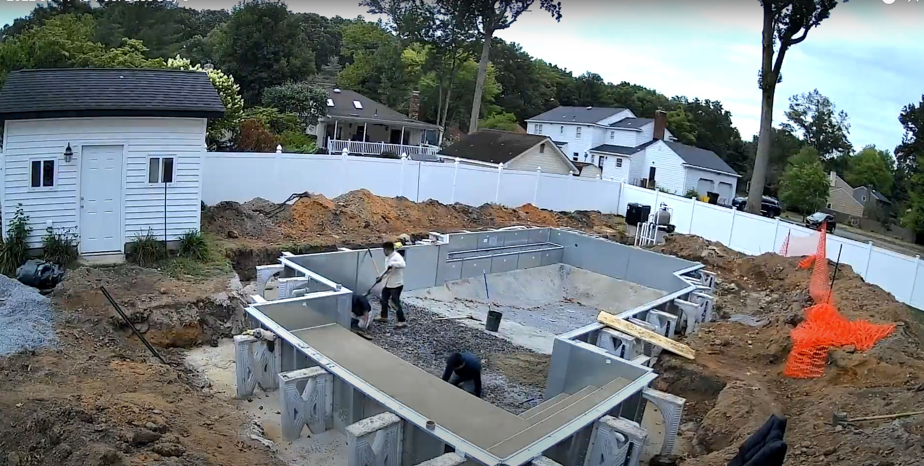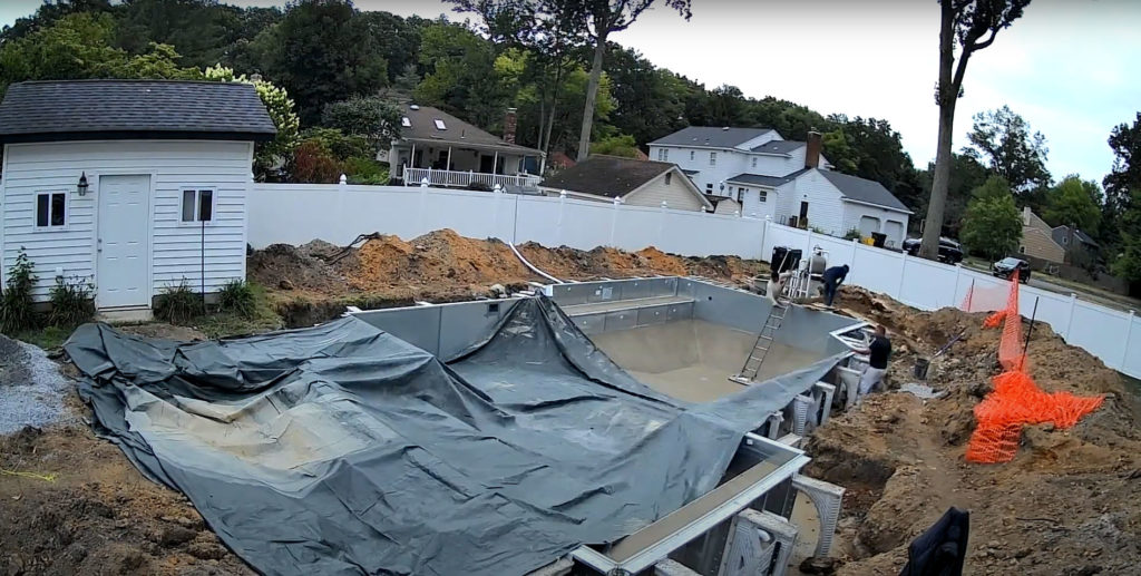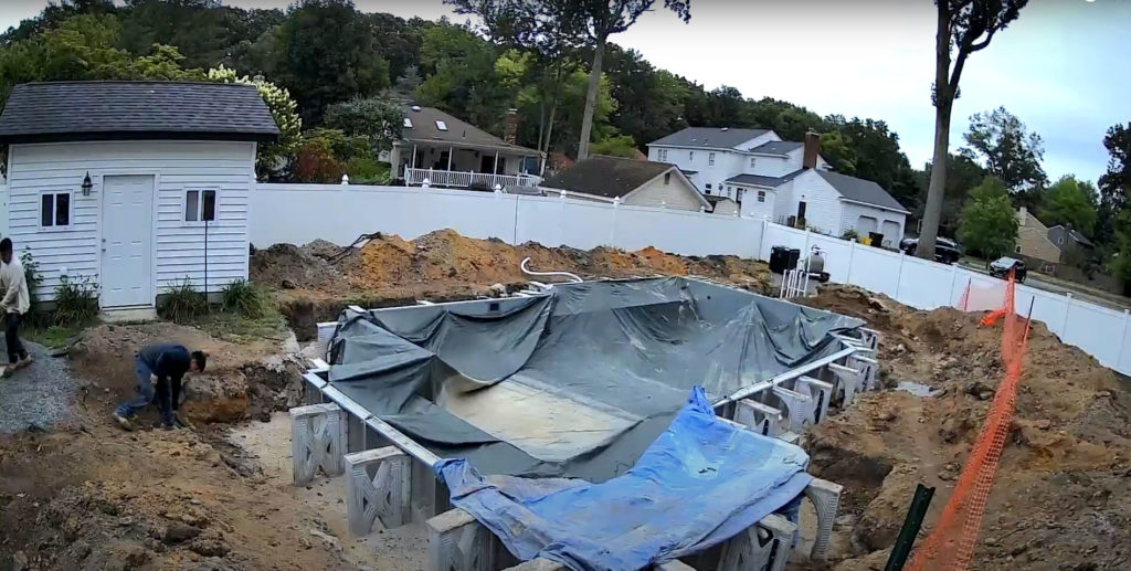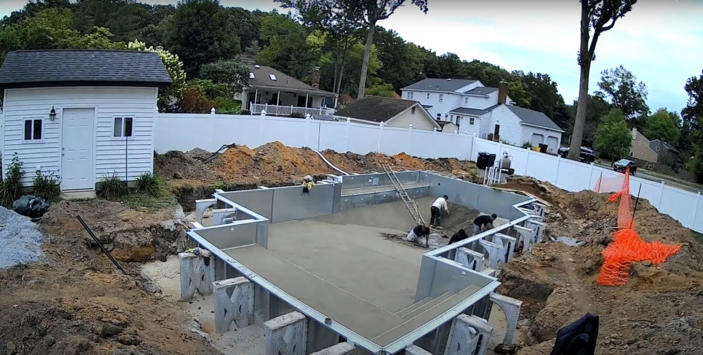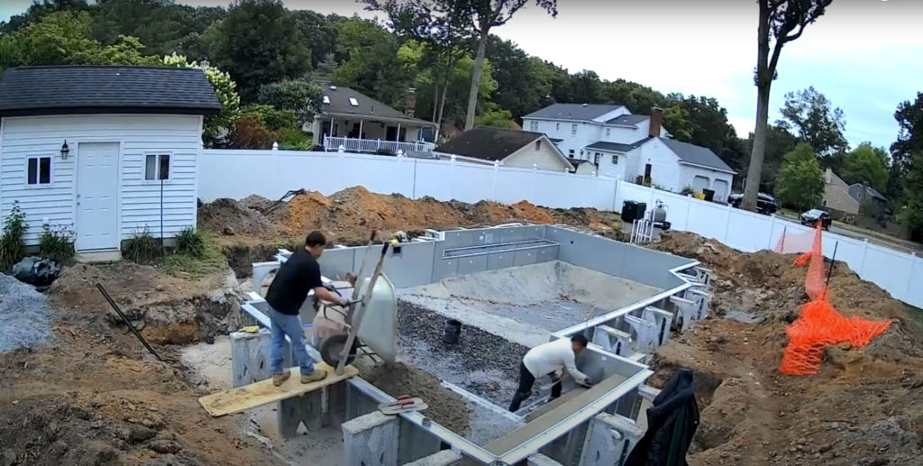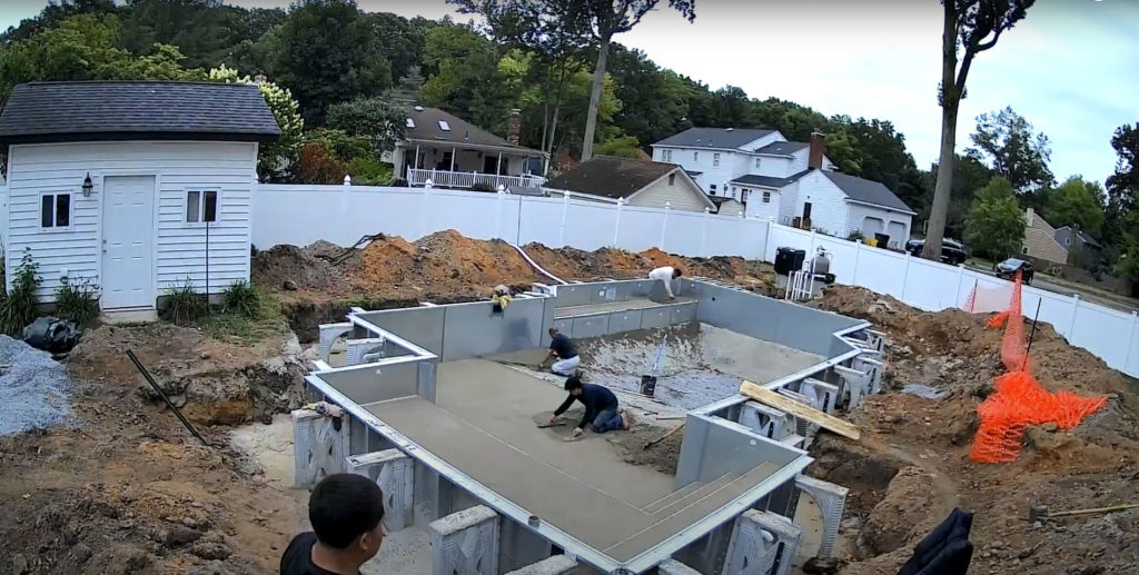 They put down the vermiculite pool base, the smooth surface under the liner. They started by filling in the bench and the sundeck and then moved down into the deep end.