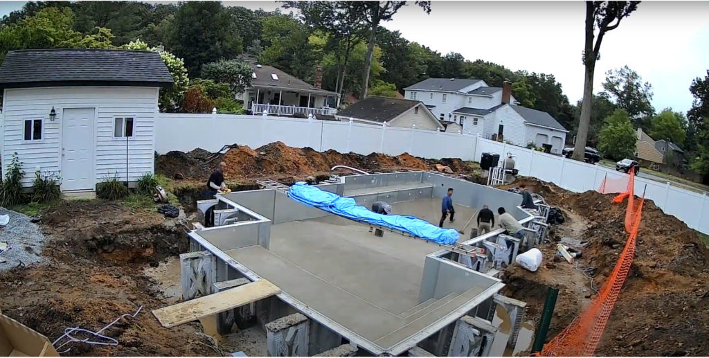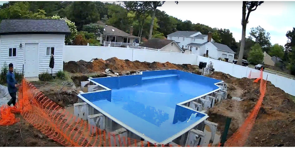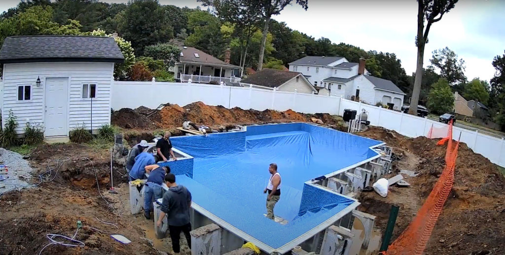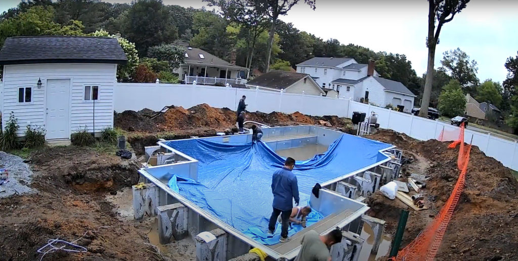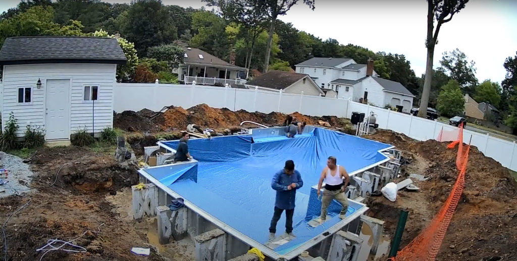 The rain the night before wasn’t an issue at all. They took the protective tarp off and smoothed out the base and then got to work on the liner.